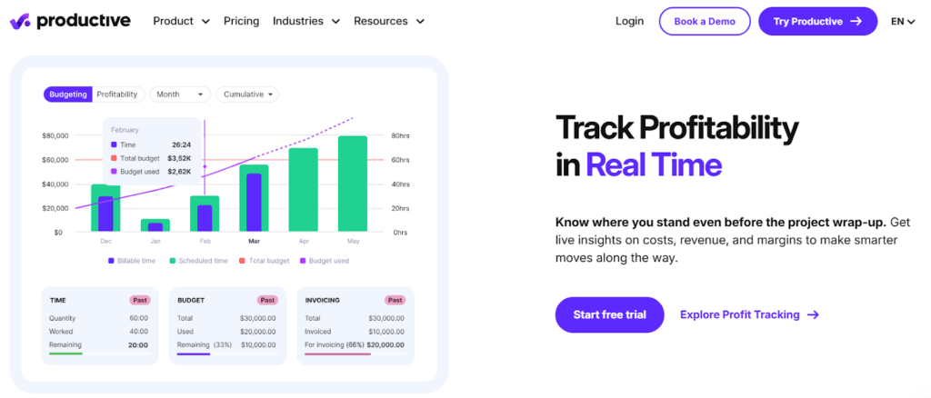 Productive.io combines CRM, sales pipeline tracking, project management, time tracking, and invoicing. This makes it a true end-to-end platform for agencies that want to replace multiple separate tools. - Profitability Insights
